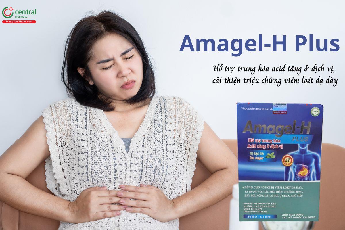 - Amagel-H Plus kết hợp 2 hoạt chất kháng axit gồm Magie Hydroxyd và Nhôm hydroxyd, cho tác dụng giảm acid dịch vị nhanh, góp phần làm dịu niêm mạc dạ dày và giảm các triệu chứng đau dạ dày, ợ hơi, ợ chua do acdi dịch vị tăng.