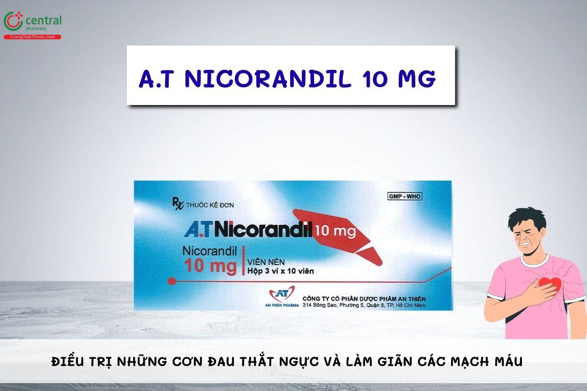 Thuốc A.T Nicorandil 10 mg được chỉ định điều trị triệu chứng đau thắt ngực mạn tính ổn định khi không dung nạp hoặc có chống chỉ định với thuốc chẹn beta và/hoặc chẹn kênh calci.[1]