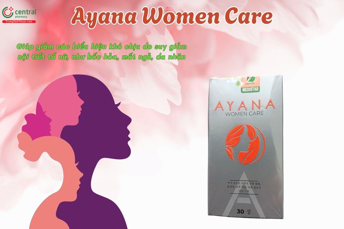 Viên uống Ayana Women Care giúp giảm các biểu hiện khó chịu do suy giảm nội tiết tố nữ, bao gồm bốc hỏa, mất ngủ, da nhăn, khô và suy giảm ham muốn, đồng thời hỗ trợ duy trì sức khỏe tổng thể và cân bằng hormone.