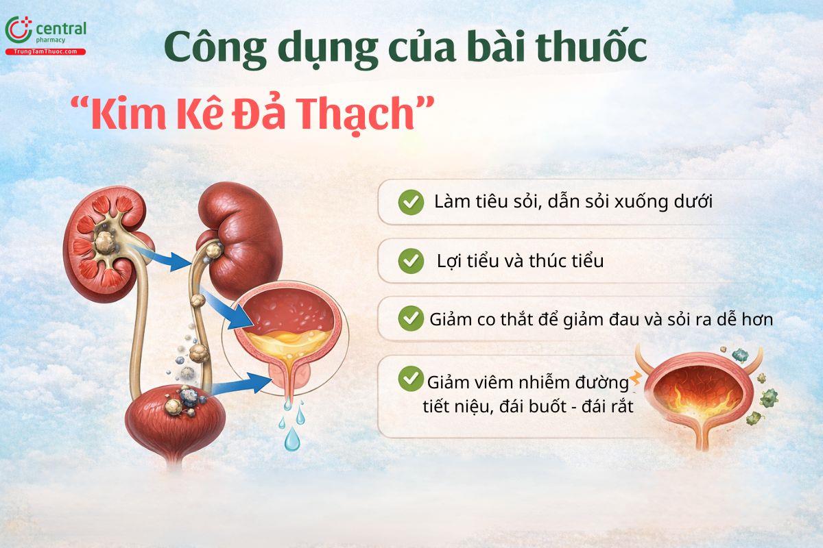 Sự phối hợp các vị thuốc trong Kim Kê Đả Thạch giúp làm nhỏ và đẩy sỏi di chuyển xuống dưới, đồng thời tăng bài tiết nước tiểu, giúp sỏi được đào thải thuận lợi hơn.