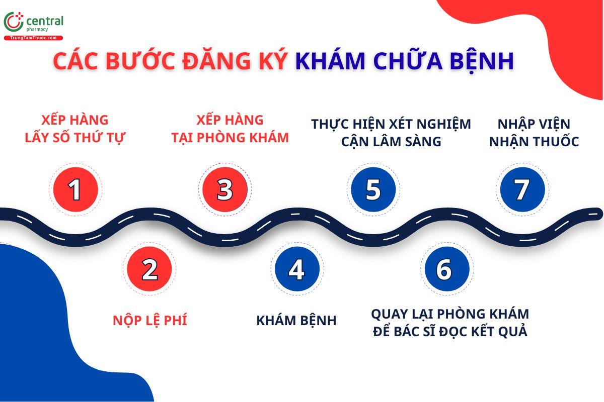 Bước 7 - Hoàn tất thủ tục: Nếu bác sĩ yêu cầu nhập viện, bạn sẽ hoàn tất các thủ tục cần thiết và được nhân viên y tế hướng dẫn vào viện. Nếu không, bạn sẽ đến quầy thuốc để nhận thuốc theo đơn.