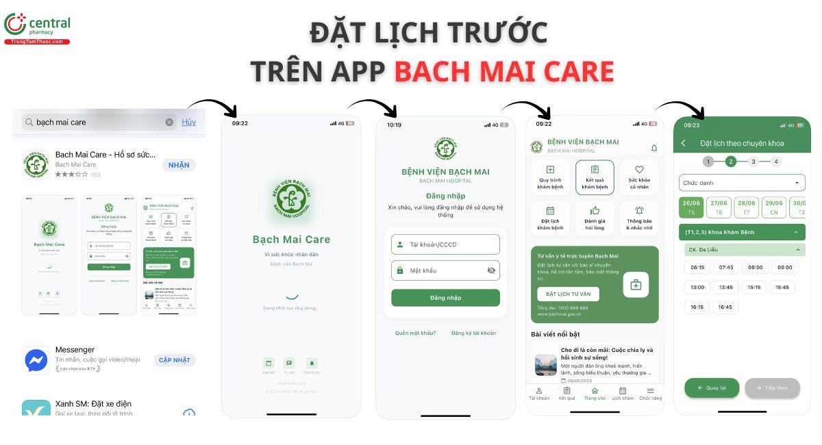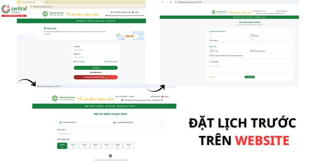 Để tiết kiệm thời gian và chủ động hơn trong việc thăm khám, bạn nên đặt lịch trước qua các kênh như tổng đài 1900.888.866, website https://dkkham.bachmai.gov.vn/dat-lich, hoặc ứng dụng Bạch Mai Care.
