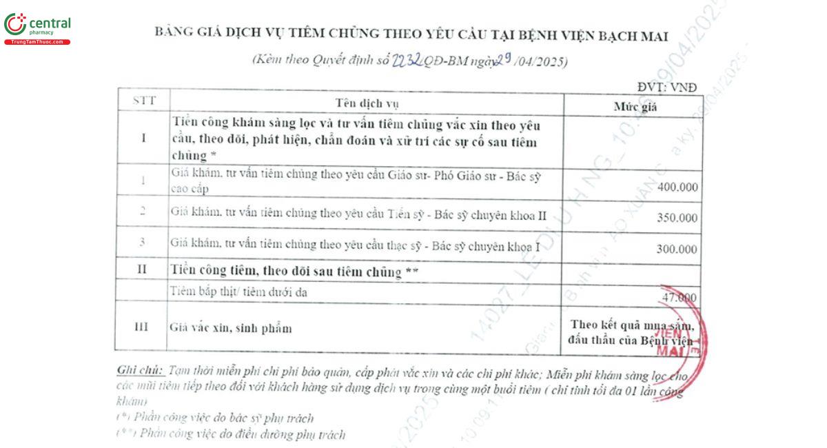 Bảng giá dịch vụ tiêm chủng theo yêu cầu tại Bệnh viện Bạch Mai.