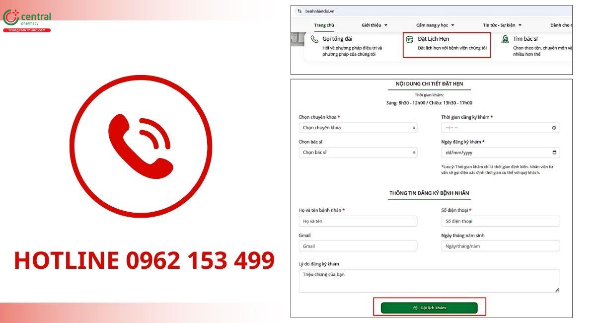 Cách 1: Đặt lịch qua HOTLINE 0962 153 499. Sau đó làm theo hướng dẫn của nhân viên y tế.