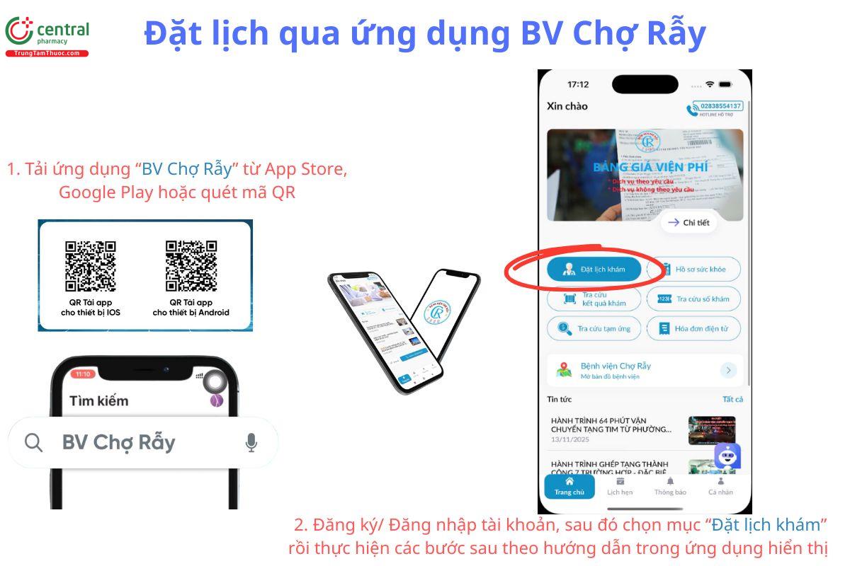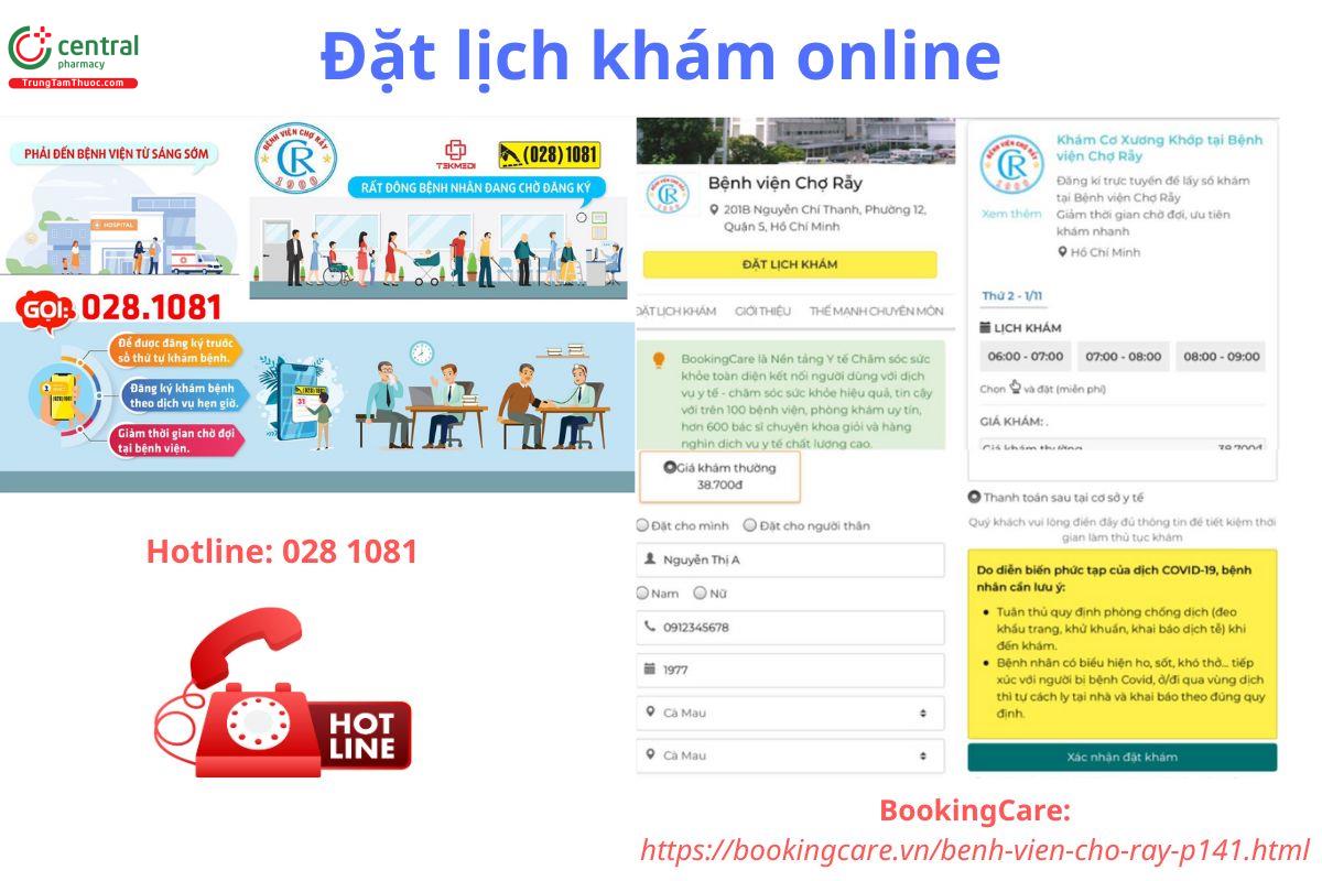 - Cách 2 - Đặt lịch qua nền tảng BookingCare: Người bệnh truy cập hệ thống BookingCare, tìm kiếm Bệnh viện Chợ Rẫy và thực hiện các bước đăng ký theo hướng dẫn. Cách này giúp dễ dàng lựa chọn đúng chuyên khoa và thời gian khám phù hợp với nhu cầu cá nhân.