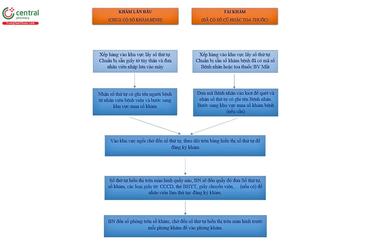 Bước 1: Xếp hàng vào khu vực lấy số thứ tự. Chuẩn bị sẵn số khám bệnh đã có mã số Bệnh nhân hoặc toa thuốc Bệnh viện Mắt.