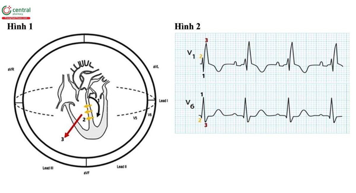 3) Sự hoạt hóa của thất phải bắt nguồn từ bên kia vách ngăn. Vectơ khứ cức kết quả (mũi tên đó) tạo ra sông R chậm ở các chuyến đạo V1-3 và sóng 8 ở V6 được đánh đầu là 3 trong Hình 2.