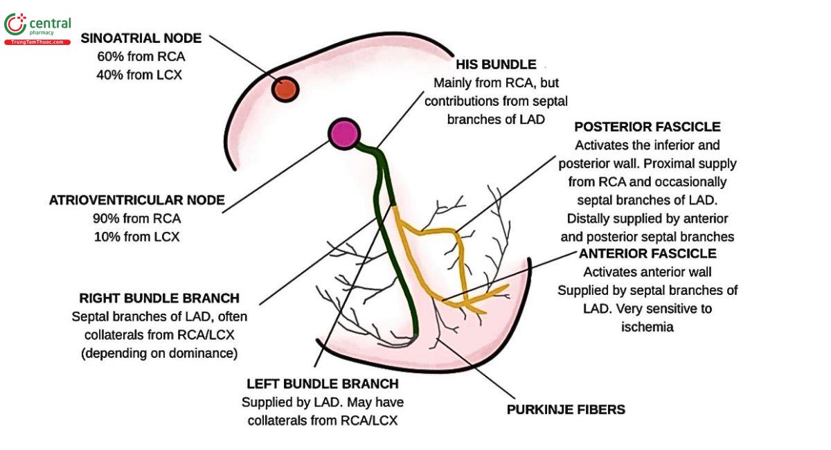 - Mạch máu thường bị ảnh hưởng nhất: động mạch vành trái trước gần động mạch xuyên vách ngăn.