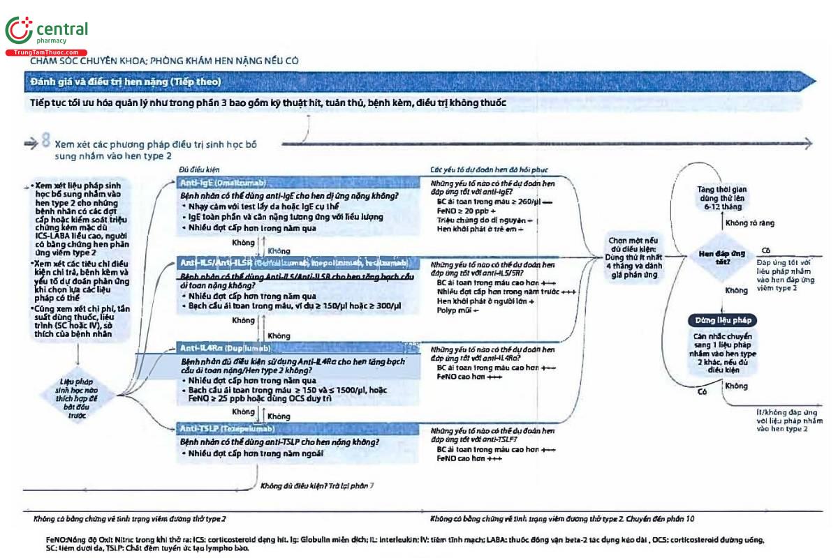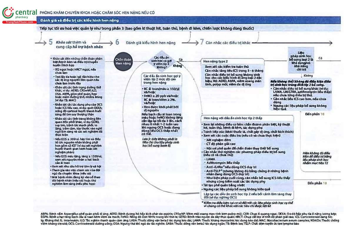 | Để xác định hen nặng típ 2 ở bệnh nhân đang điều trị ICS liều cao, cần lặp lại xét nghiệm BEC và FeNO tối đa 3 lần. Đối với bệnh nhân đang dùng OCS, nên xét nghiệm các dấu ấn sinh học nếu có thể, ít nhất 1-2 tuần sau khi kết thúc một đợt điều trị OCS ngắn hạn, hoặc khi bệnh nhân đang dùng liều duy trì thấp nhất có thể; tạm ngừng OCS duy trì trong 2 ngày có thể làm BEC tăng trở lại. | ||