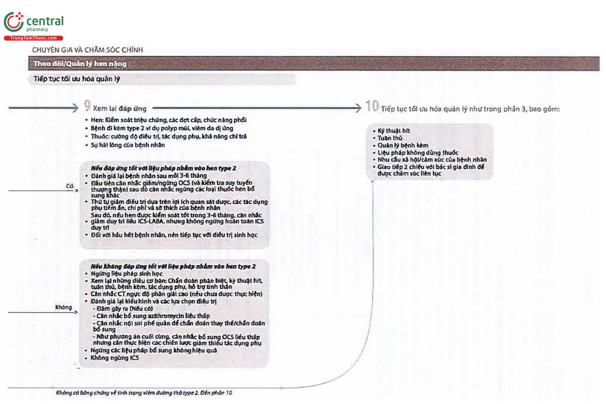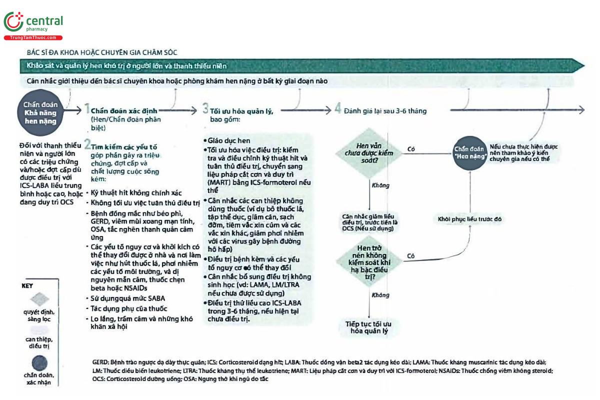 Sơ đồ bên dưới cung cấp thông tin ngắn gọn về những gì cần cân nhắc trong từng giai đoạn của quá trình chẩn đoán và quản lý hen nặng và hen khó trị. Sơ đồ được chia thành ba giai đoạn lớn: