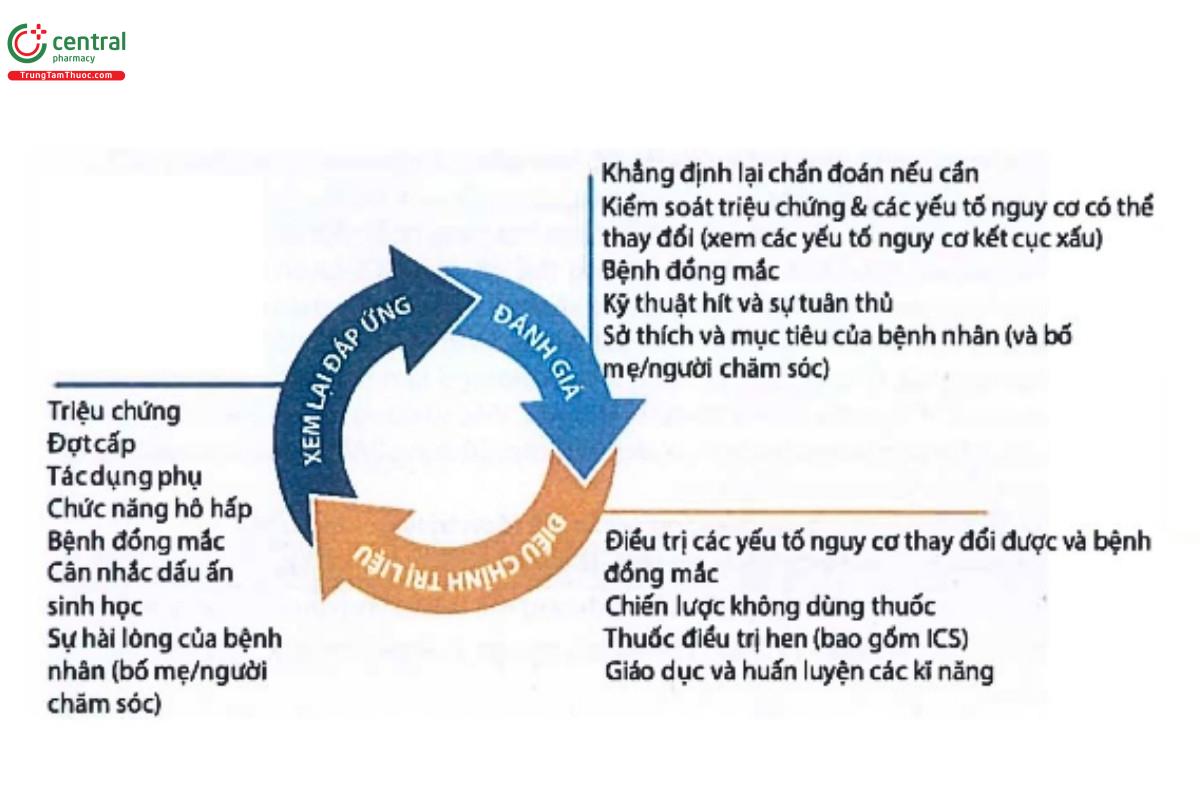 | 1. Đánh giá Đánh giá lại tình trạng hiện tại của bệnh nhân bao gồm kiểm soát triệu chứng, chức năng hô hấp và các yếu tố nguy cơ. Nếu bệnh nhân có các yếu tố nguy cơ gây ra cơn hen cấp, chỉ hạ bậc điều trị khi có sự giám sát chặt chẽ, Lựa chọn thời điểm phù hợp (ví dụ: không bị nhiễm trùng đường hô hấp, không đi du lịch, không mang thai). Cung cấp một kế hoạch hành động để bệnh nhân/người chăm sóc biết cách nhận biết và phản ứng nếu các triệu chứng trở nên trầm trọng hơn. Đảm bảo bệnh nhân có đủ thuốc để có thể tiếp tục sử dụng liều trước đó nếu hen trở nên trầm trọng hơn sau khi giảm liều. |