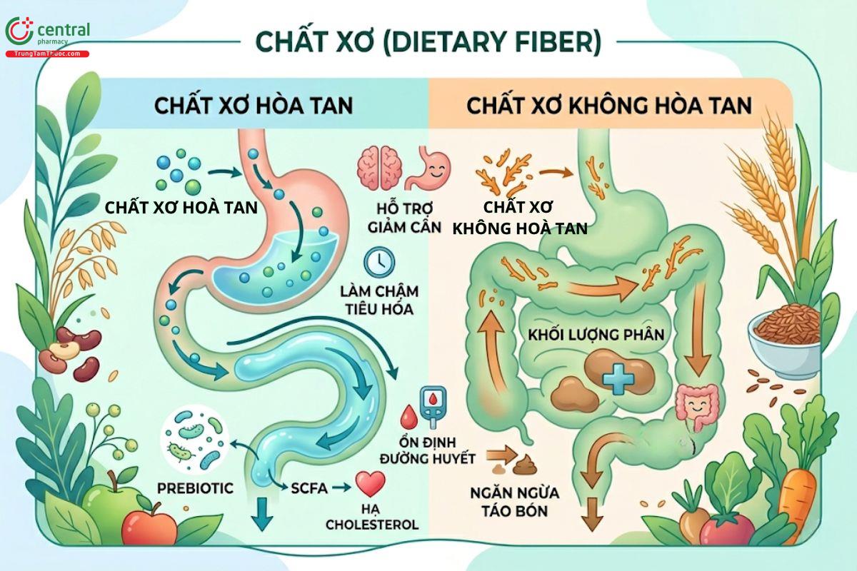 Chất xơ là dạng carbohydrate không bị enzyme tiêu hóa phân giải, nên đi qua dạ dày và ruột non gần như nguyên vẹn trước khi đến đại tràng để được vi khuẩn đường ruột lên men. Có hai nhóm chính: chất xơ hòa tan (tan trong nước, tạo dạng gel) và chất xơ không hòa tan (không tan, giúp tăng khối lượng phân và hỗ trợ nhu động ruột).