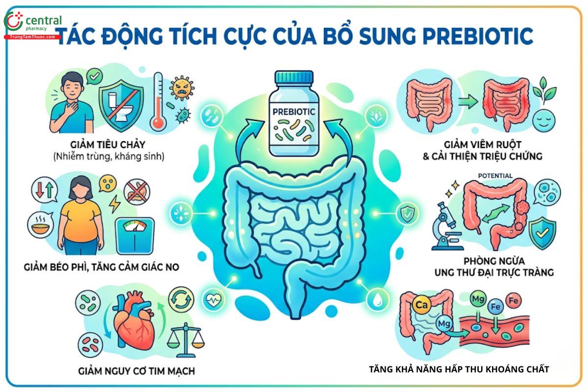 Mặc dù bằng chứng về lợi ích sức khỏe của prebiotic còn hạn chế so với chất xơ trong chế độ ăn, nhiều nghiên cứu vẫn cho thấy việc bổ sung prebiotic có thể mang lại một số tác động tích cực như: