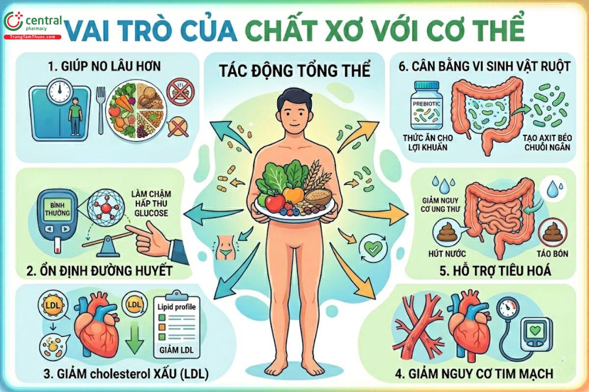 Việc bổ sung chất xơ hợp lý trong khẩu phần ăn không chỉ hỗ trợ tiêu hóa mà còn góp phần cải thiện nhiều chức năng sinh lý khác của cơ thể.