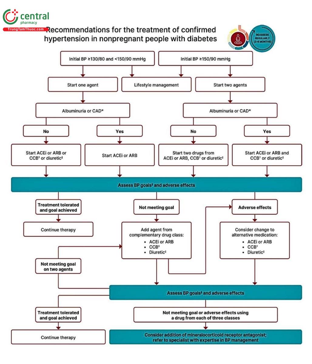 10.7. Những người có huyết áp đo tại phòng khám ≥150/90mmHg đã được xác nhận, ngoài thay đổi lối sống, cần được khởi trị sớm và chuẩn liều kịp thời bằng hai thuốc hoặc một viên phối hợp liều cố định (single-pill combination) gồm các thuốc hạ huyết áp đã được chứng minh làm giảm biến cố tim mạch ở người đái tháo đường.A