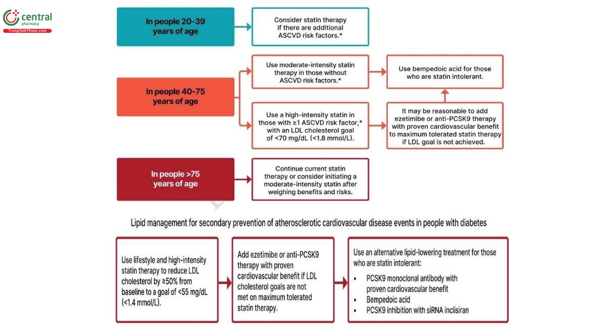 10.26. Ở mọi lứa tuổi mắc đái tháo đường và bệnh lý xơ vữa động mạch (ASCVD), cần bổ sung statin liều cao (high-intensity) vào liệu pháp thay đổi lối sống. A