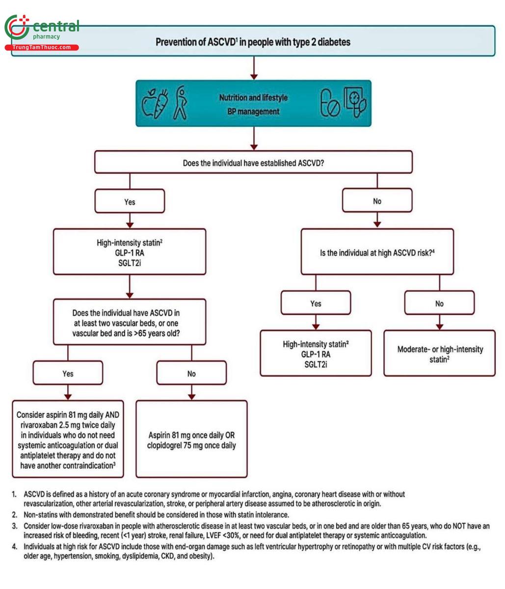 10.40d. Ở người đái tháo đường type 2 có ASCVD, hoặc nhiều yếu tố nguy cơ ASCVD, có thể xem xét phối hợp SGLT2 inhibitor + GLP-1 RA (đều có lợi ích tim mạch) để giảm thêm nguy cơ biến cố tim mạch và thận. B