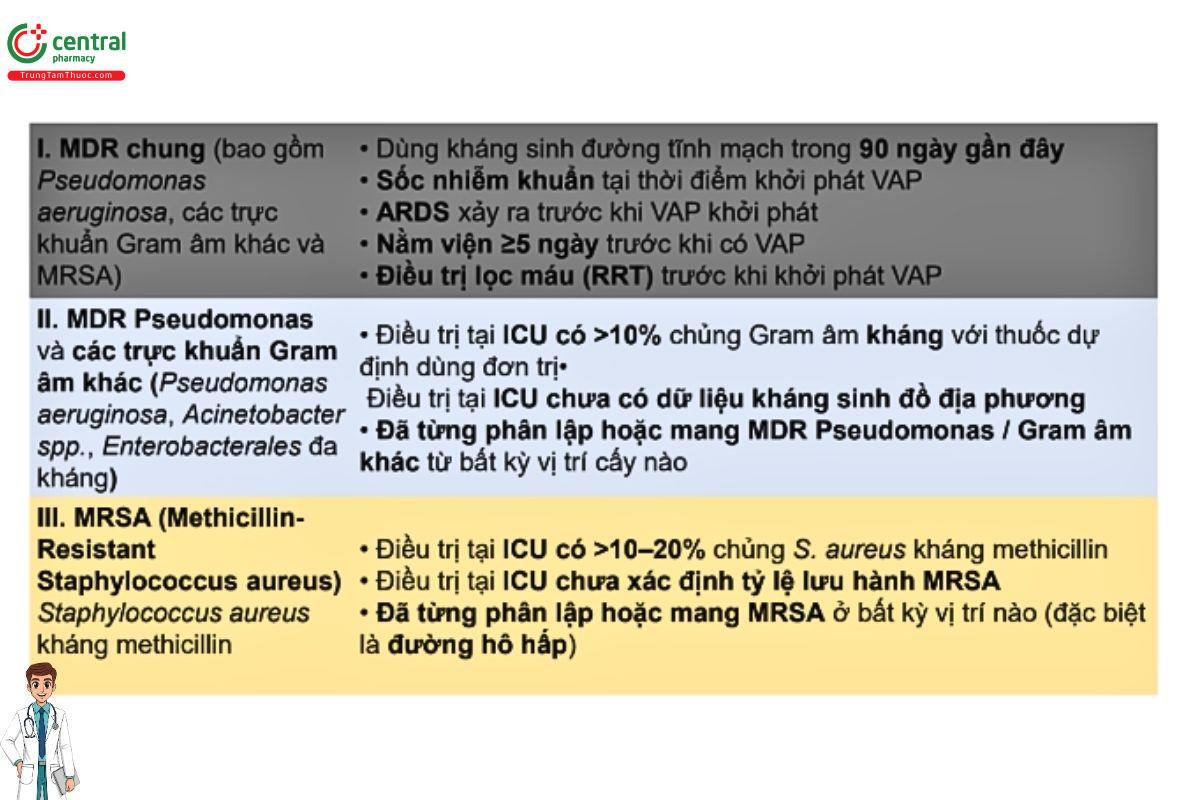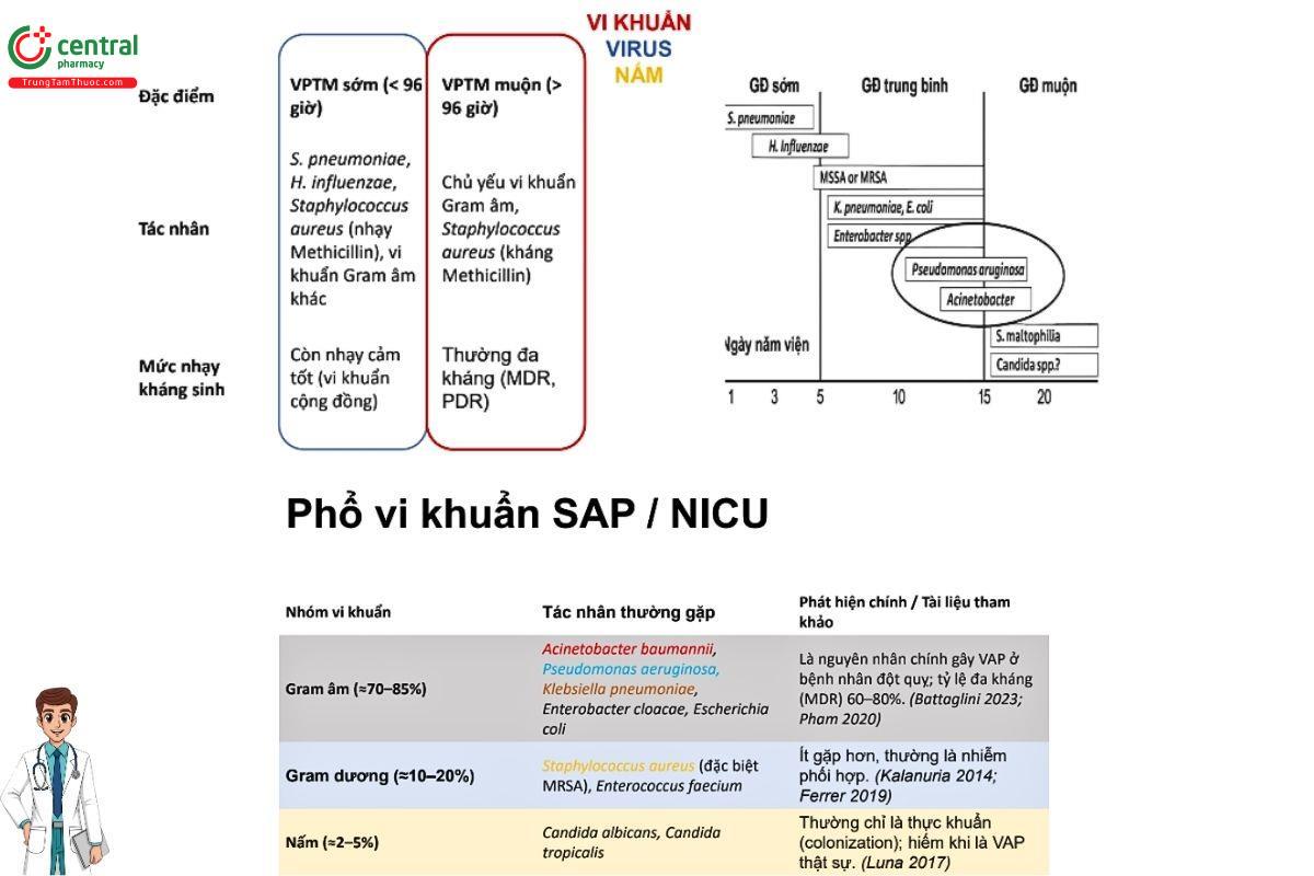 ▪ Phổ vi khuẩn gây VAP trong các NICU, ICU đều là MDR, PDR (bao gồm trực khuẩn mủ xanh, và các vi khuẩn gram – đa kháng và tụ cầu vàng kháng Methicillin -MRSA) – tỷ lệ thất bại điều trị cao
