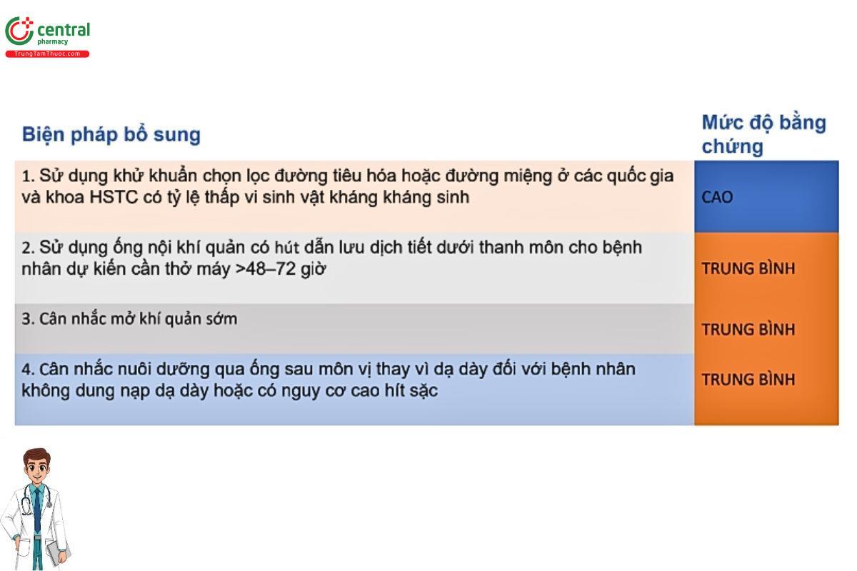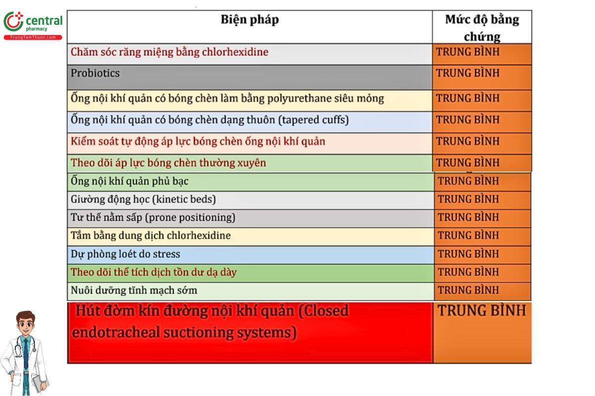 DVTP: Dự phòng huyết khối tĩnh mạch sâu; ETT: Ống nội khí quản; HOB: Đầu giường; ICU: Đơn vị chăm sóc đặc biệt; MV: Thông khí cơ học; PUP/SUP: Dự phòng loét dạ dày tá tràng/Dự phòng loét do căng thẳng; SOD: Khử nhiễm vùng hầu họng có chọn lọc; SSD: Tiết dịch dưới thanh môn; -: Không có sẵn.