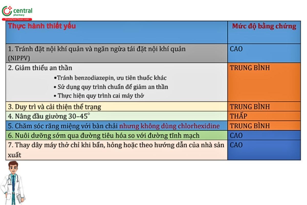 Cải thiện kết quả và giảm mức độ tiếp xúc với MV phải là ưu tiên và mục tiêu của việc thực hiện các gói phòng ngừa. Chiến lược an thần phải là yếu tố cốt lõi của gói chăm sóc thông khí. Nhắm mục tiêu mức độ an thần nhẹ và sử dụng chiến lược an thần bao gồm thuốc giảm đau an thần tác dụng ngắn được ưu tiên hơn, do đó giúp cai máy thở sớm và giảm tỷ lệ viêm phổi và tử vong ở bệnh nhân thở máy trong ICU. [55-59]