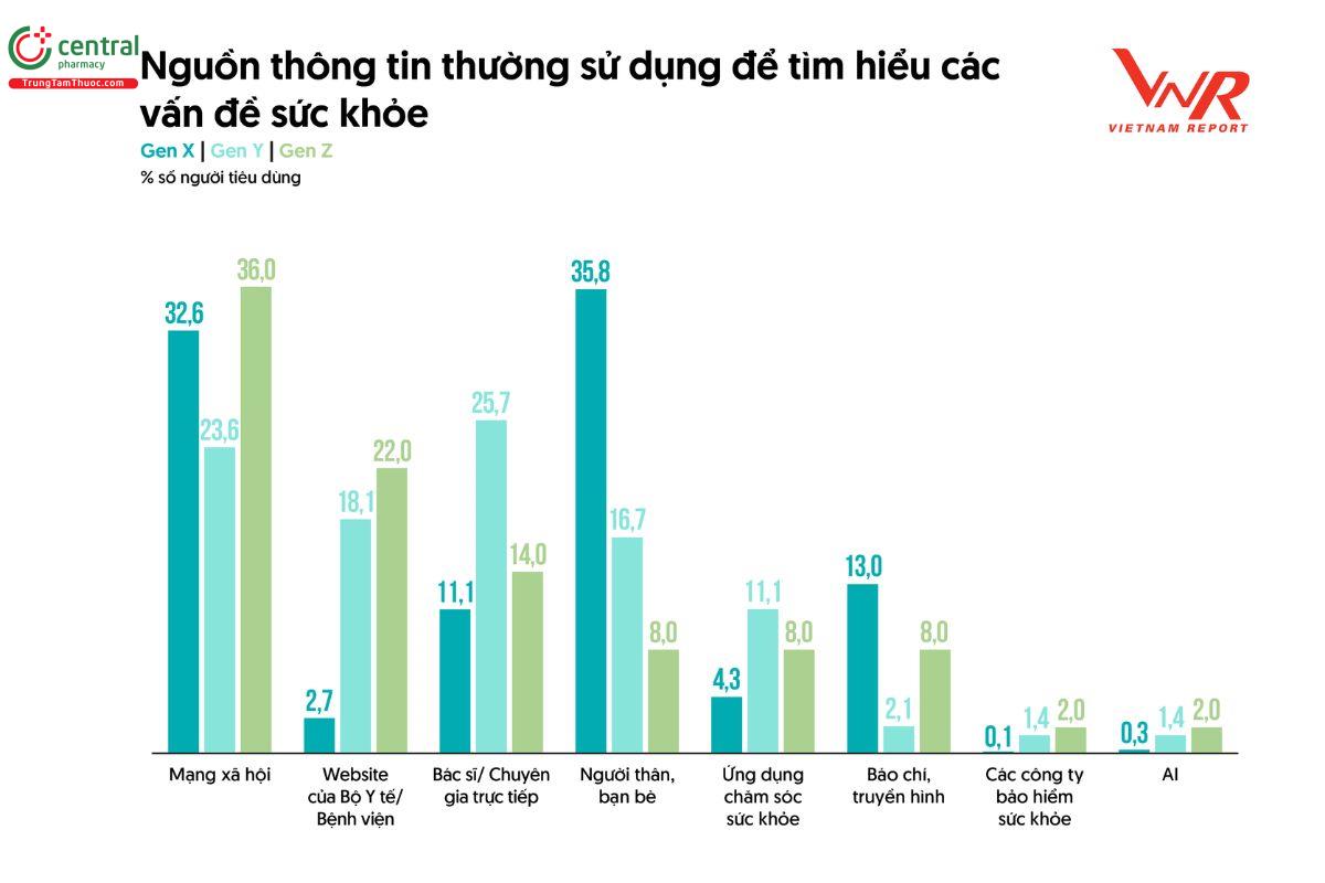 Khảo sát của Vietnam Report cho thấy mỗi thế hệ có cách tiếp cận thông tin sức khỏe khác nhau, từ đó ảnh hưởng trực tiếp đến hành vi lựa chọn sản phẩm và dịch vụ y tế. Mạng xã hội trở thành kênh được dùng nhiều nhất, đặc biệt với Gen Z (36%), đồng thời đứng thứ hai ở Gen X (32,6%) và Gen Y (23,6%). Sự phổ biến của mạng xã hội đi kèm rủi ro tin giả, đặt ra yêu cầu các tổ chức y tế phải chủ động xuất hiện trên nền tảng số để cung cấp thông tin chính xác.