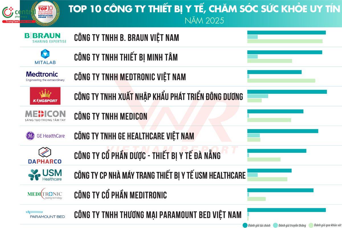 Bảng xếp hạng năm 2025 tiếp tục ghi nhận sự ổn định ở vị trị dẫn đầu là Công ty TNHH B. Braun Việt Nam. Bên cạnh đó là sự vươn lên của Công ty TNHH Thiết Bị Minh Tâm ở vị trí số 2 và Công ty TNHH Medtronic Việt Nam ở vị trí số 3.