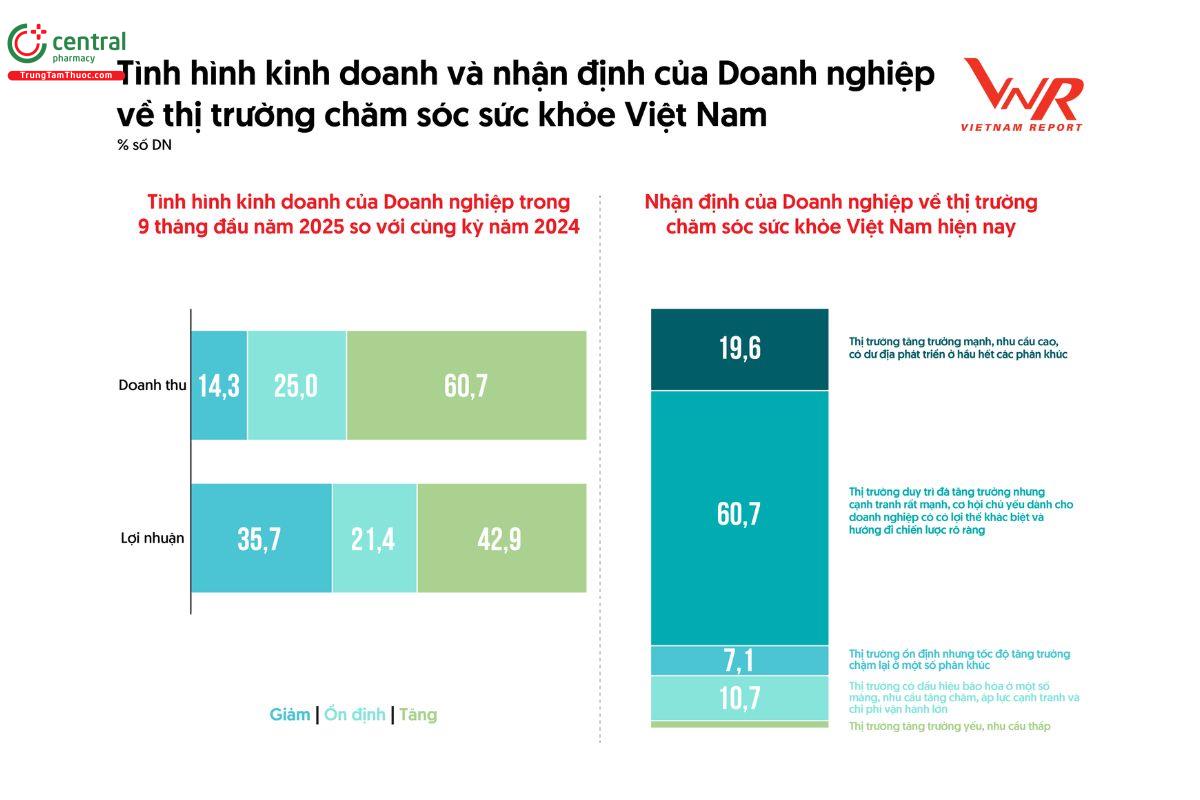 Bức tranh kinh doanh 9 tháng đầu năm 2025 của nhóm Dược – Thiết bị y tế – Chăm sóc sức khỏe và hệ thống bệnh viện tư nhân cho thấy xu hướng tăng trưởng nhưng phân hóa mạnh. Khảo sát của Vietnam Report cho thấy 60,7% doanh nghiệp ghi nhận doanh thu ba quý đầu tăng trưởng so với cùng kỳ. Tuy nhiên, tăng trưởng doanh thu không đi đôi với lợi nhuận khi 42,9% doanh nghiệp có lợi nhuận tăng, trong khi 35,7% lại sụt giảm. Kết quả kinh doanh và triển vọng của từng nhóm khác nhau đáng kể, tùy thuộc vào chiến lược đầu tư sản phẩm, công nghệ, quản trị và khả năng tận dụng khung chính sách mới.