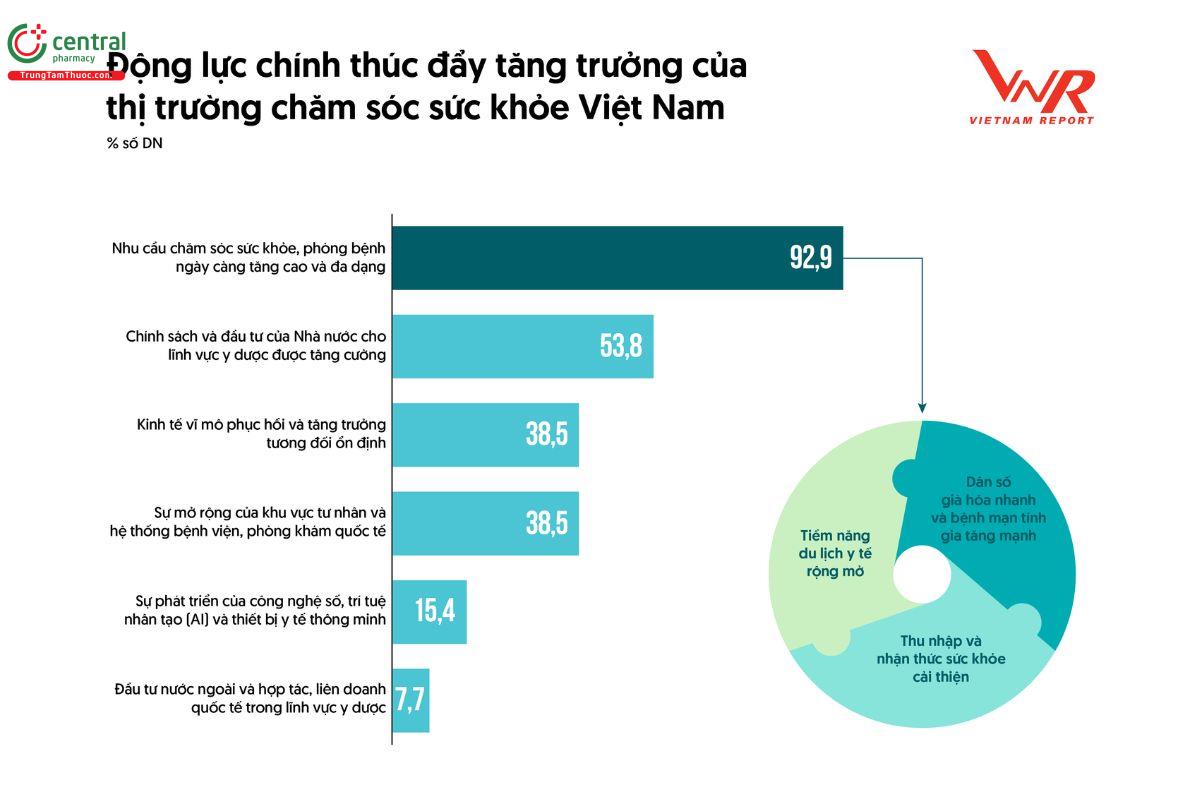 Nhu cầu chăm sóc sức khỏe tăng mạnh, kinh tế ổn định và sự phát triển của y tế tư nhân đang tạo nền tảng vững chắc cho tăng trưởng dài hạn của toàn thị trường. Những động lực này xuất phát từ biến đổi nhân khẩu học, dịch tễ học và sự chuyển dịch trong hành vi chăm sóc sức khỏe của người dân.