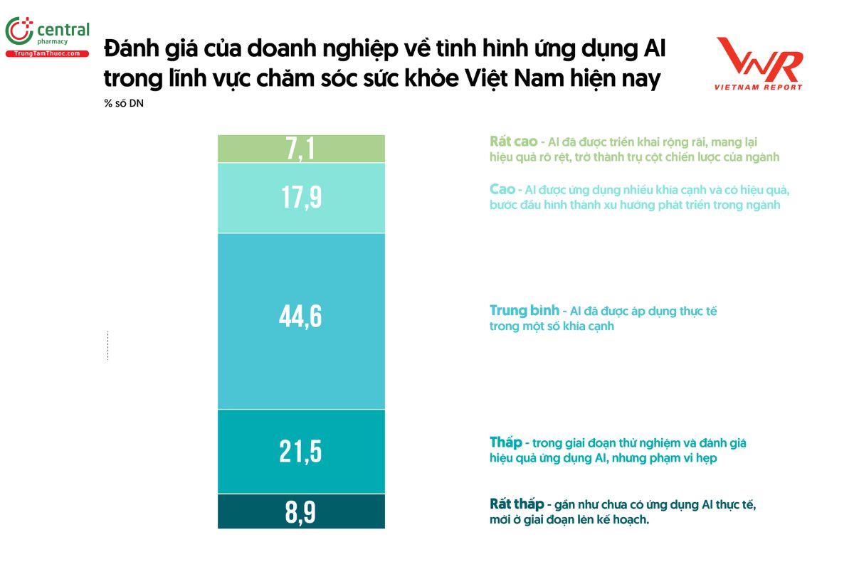 Trong ứng dụng AI, nhóm “triển khai trung bình” chiếm 44,6%, cho thấy AI đã bắt đầu đi vào thực tế nhưng mới ở giai đoạn đầu, thiếu nền tảng dữ liệu, chi phí và hành lang pháp lý đầy đủ.