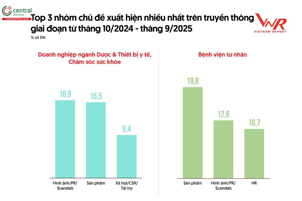 Nhóm chủ đề Hình ảnh/PR/Scandals đứng trong nhóm cao nhất do các doanh nghiệp chủ động công bố giải thưởng, chứng nhận và thành tựu chuyên môn nhằm bảo vệ hình ảnh trước bối cảnh thị trường còn xuất hiện các vụ việc liên quan đến chất lượng thuốc, đấu thầu hay dịch vụ khám chữa bệnh.