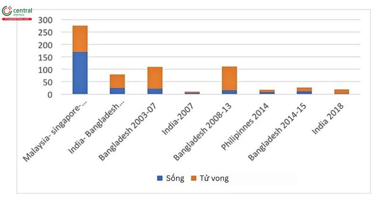 - Bangladesh đã ghi nhận các đợt bùng phát gần như hàng năm từ năm 2001, với các ổ dịch chủ yếu lây truyền qua việc tiêu thụ trái cây bị nhiễm dịch từ dơi ăn quả.