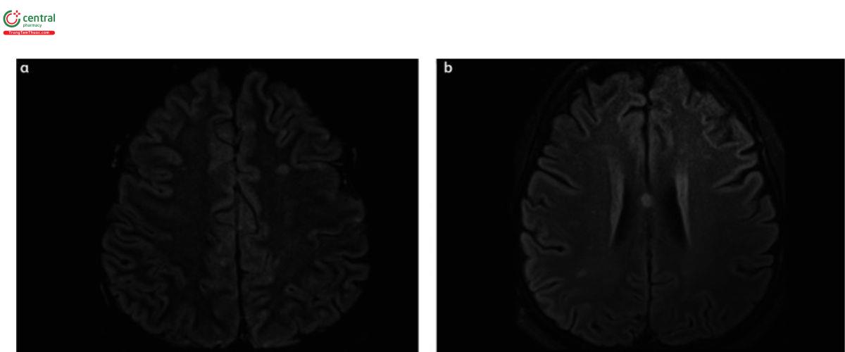 (b) Hình ảnh MRI DWI minh họa nhiều vùng tăng tín hiệu hai bên