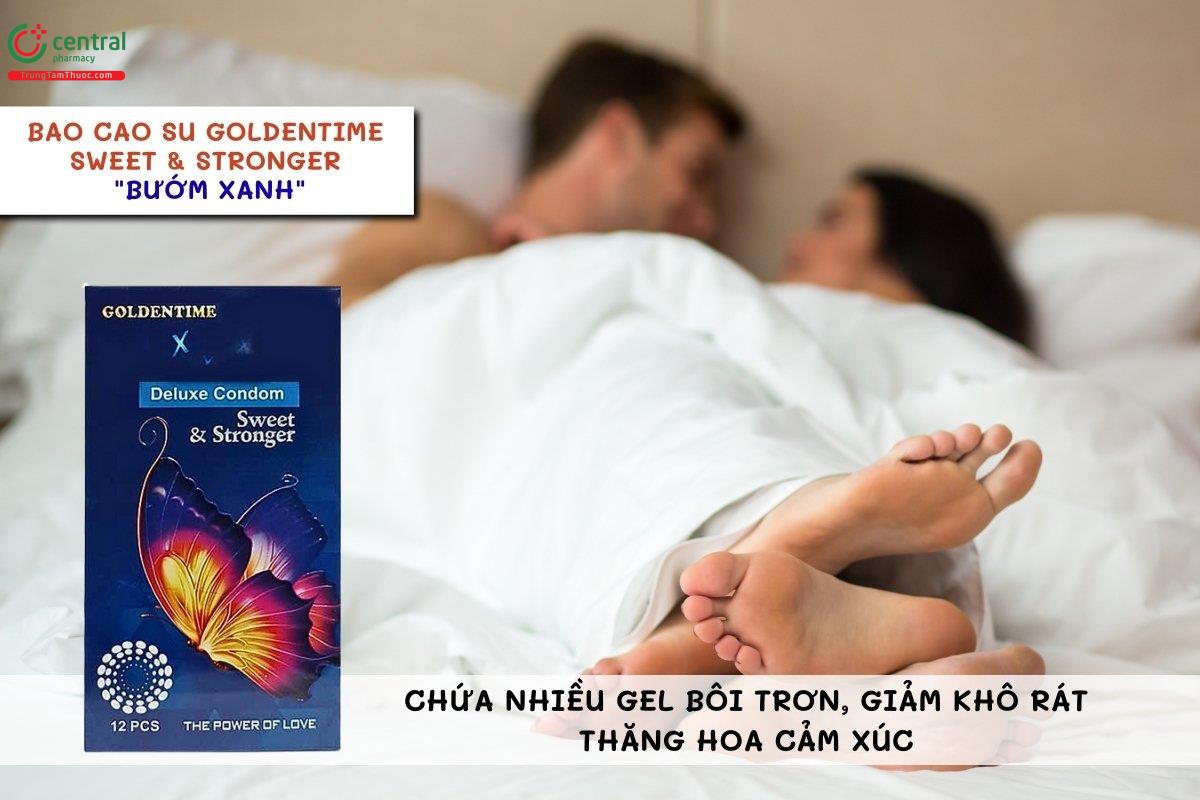 - Bao cao su Goldentime Sweet & Stronger “Bướm xanh” có tác dụng ngừa thai và phòng ngừa các bệnh lây qua đường tình dục, giúp bảo vệ sức khỏe và giảm nguy cơ lây nhiễm bệnh.