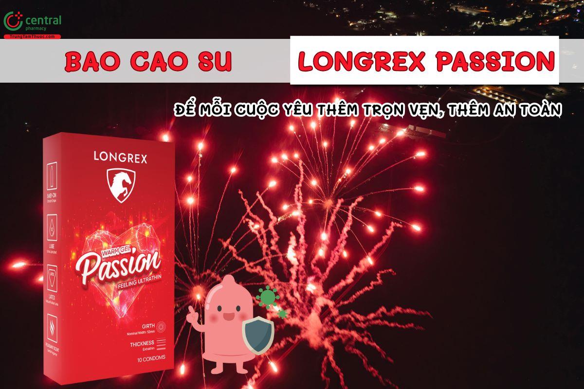 - Bao cao su gốc nước Longrex Passion được làm từ cao su thiên nhiên siêu mỏng, có tinh chất truyền nhiệt, làm tăng cảm giác ấm áp, giúp cuộc yêu trở nên nóng bỏng và thú vị hơn.