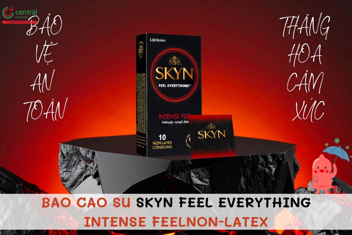 - Bao cao su Skyn Feel Everything Intense Feel Non-latex chứa cao su tinh chế, không mùi, không chứa protein gây dị ứng thường thấy trong bao cao su latex. Vì vậy đây là lựa chọn lý tưởng cho những người dị ứng với latex.
