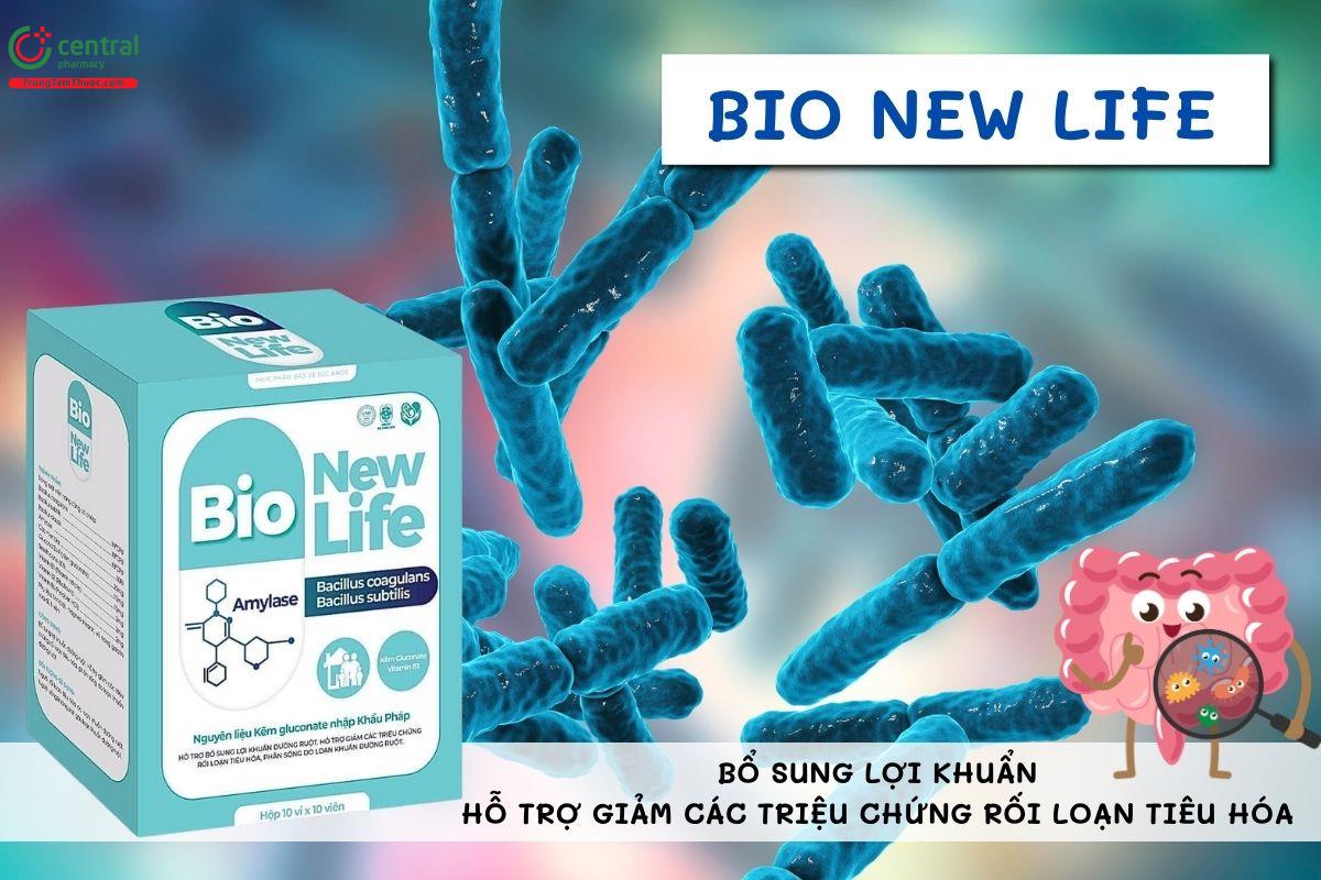 Bio New Life chứa 3 chủng lợi khuẩn Bacillus coagulans, Bacillus subtilis, Bacillus clausii giúp bổ sung lợi khuẩn, hỗ trợ giảm các triệu chứng rối loạn tiêu hóa, phân sống do mất cân bằng hệ vi sinh đường ruột.