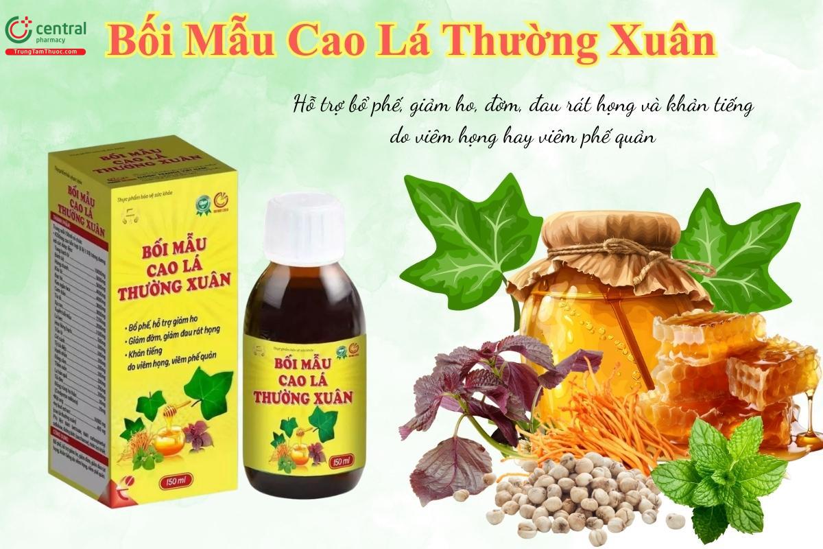 Siro ho Bối Mẫu Cao Lá Thường Xuân giúp hỗ trợ bổ phế, góp phần làm giảm ho và loãng đờm. Đồng thời hỗ trợ làm dịu cổ họng, giảm cảm giác đau rát và khàn tiếng do viêm họng hoặc viêm phế quản gây ra.