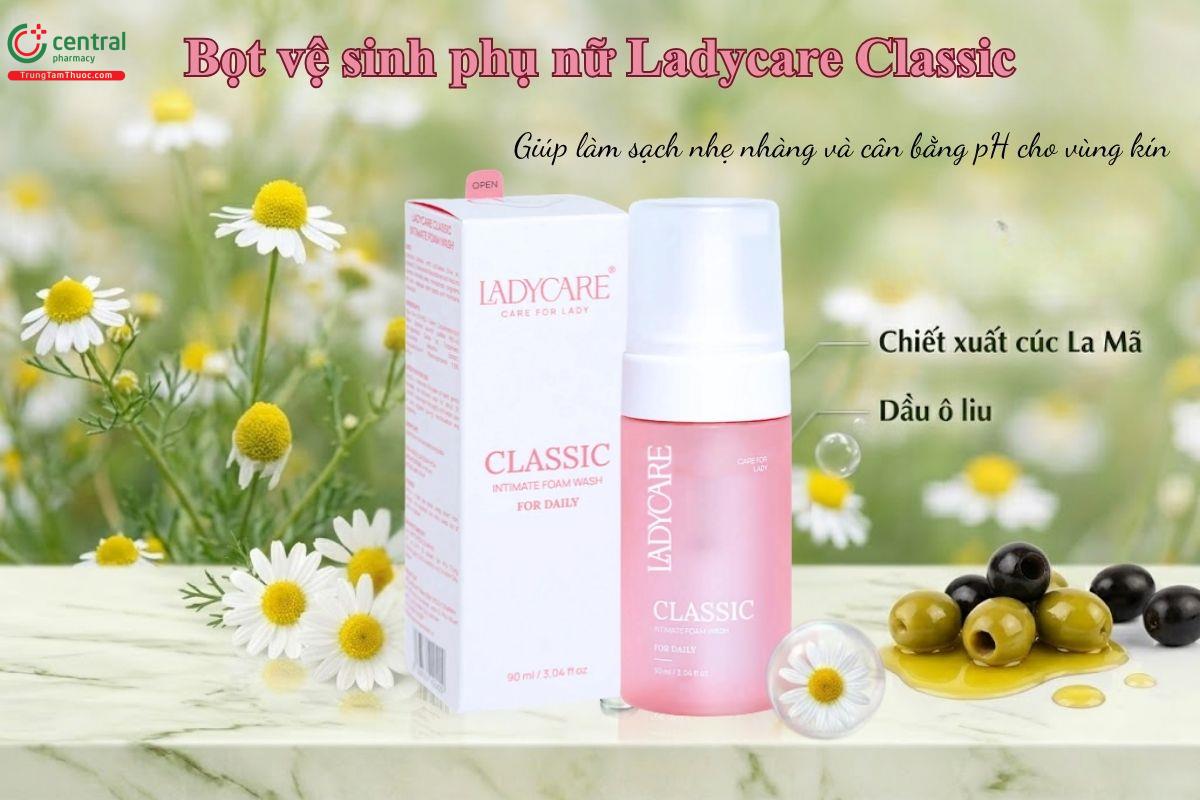 Bọt vệ sinh phụ nữ Ladycare Classic có chứa dầu ô liu, vitamin E cùng chiết xuất cúc La Mã, hỗ trợ làm sạch nhẹ nhàng, duy trì độ ẩm tự nhiên, giúp da sáng hơn, cải thiện tình trạng thâm sạm và giữ cân bằng pH sinh lý ở vùng kín.
