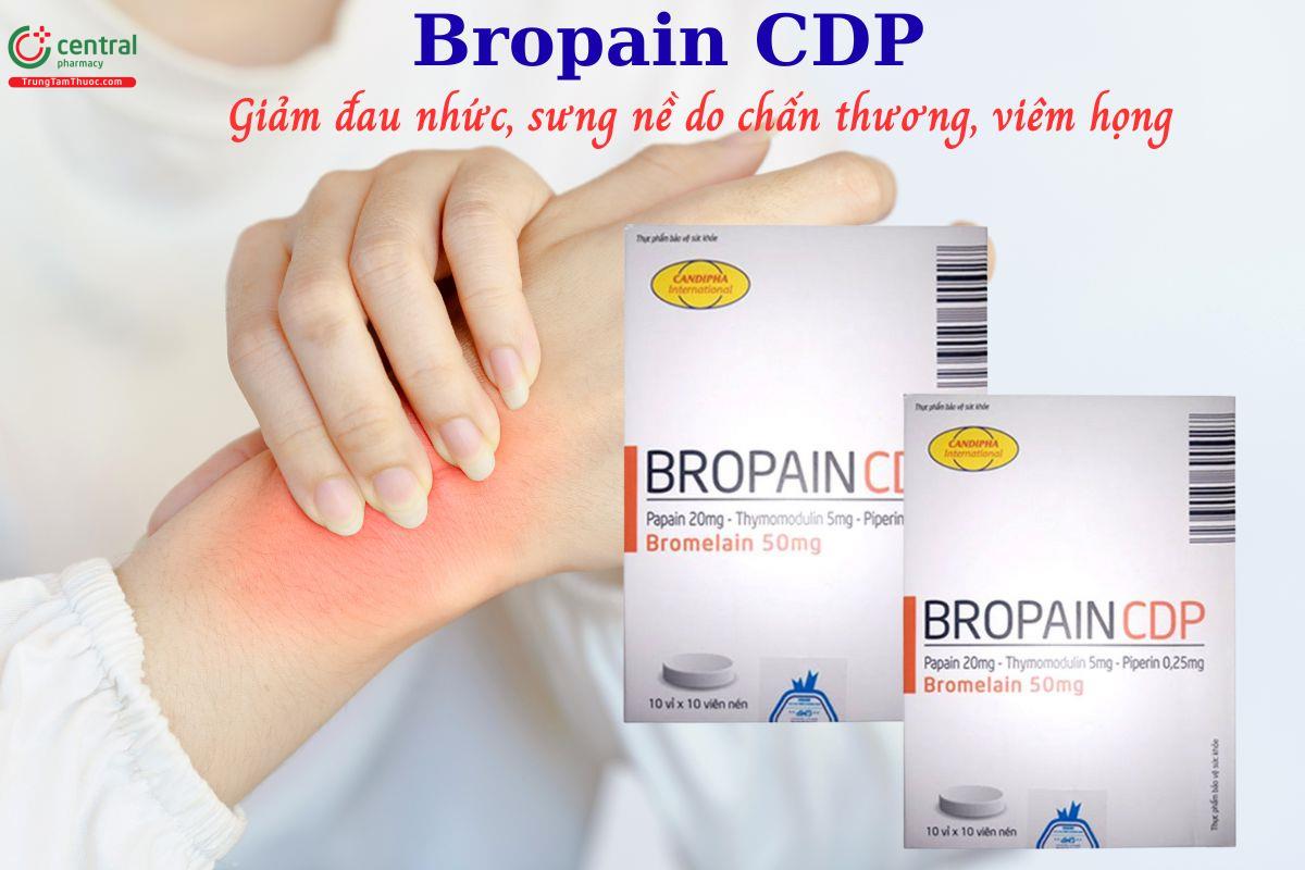 - Bropain CDP với sự kết hợp của Bromelain, Papain, Piperin, Thymomodulin mang lại hiệu quả trong việc giảm sưng viêm, đau nhức do chấn thương, sau phẫu thuật hoặc viêm họng, viêm phế quản.