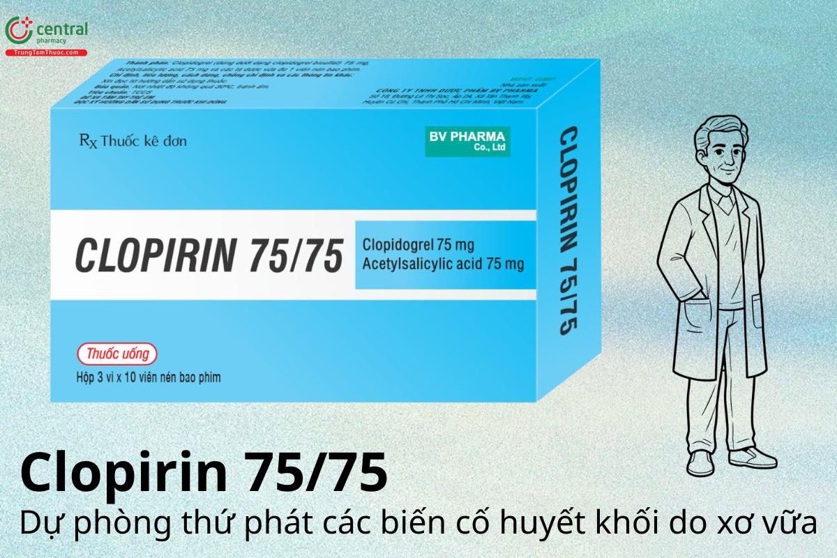 Clopirin 75/75 là thuốc kháng kết tập tiểu cầu, hoạt động bằng cách ngăn chặn các tế bào tiểu cầu trong máu kết tụ lại với nhau, từ đó phòng ngừa sự hình thành các cục máu đông (huyết khối) trong động mạch.