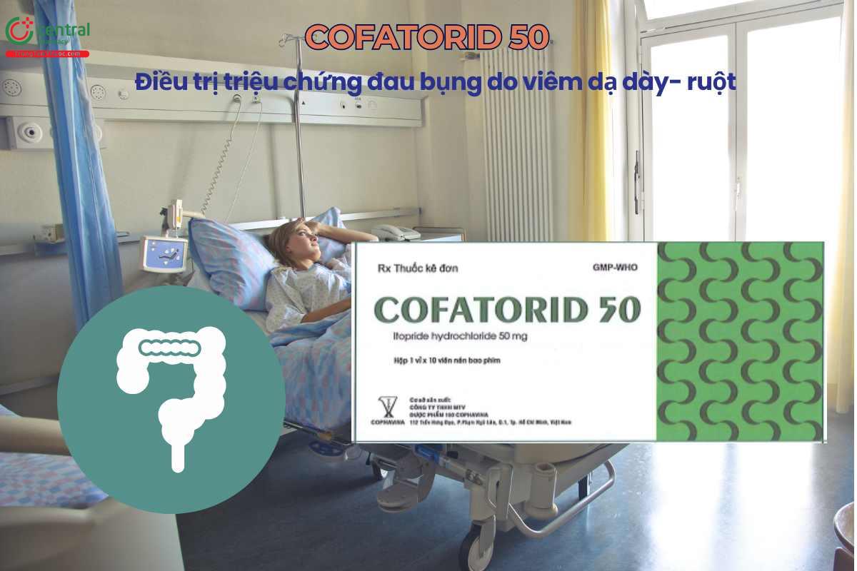 - Thuốc Cofatorid 50 giúp điều trị các triệu chứng của viêm dạ dày-ruột nhanh, hiệu quả như các biểu hiện chướng bụng, chán ăn, buồn nôn, đau bụng.