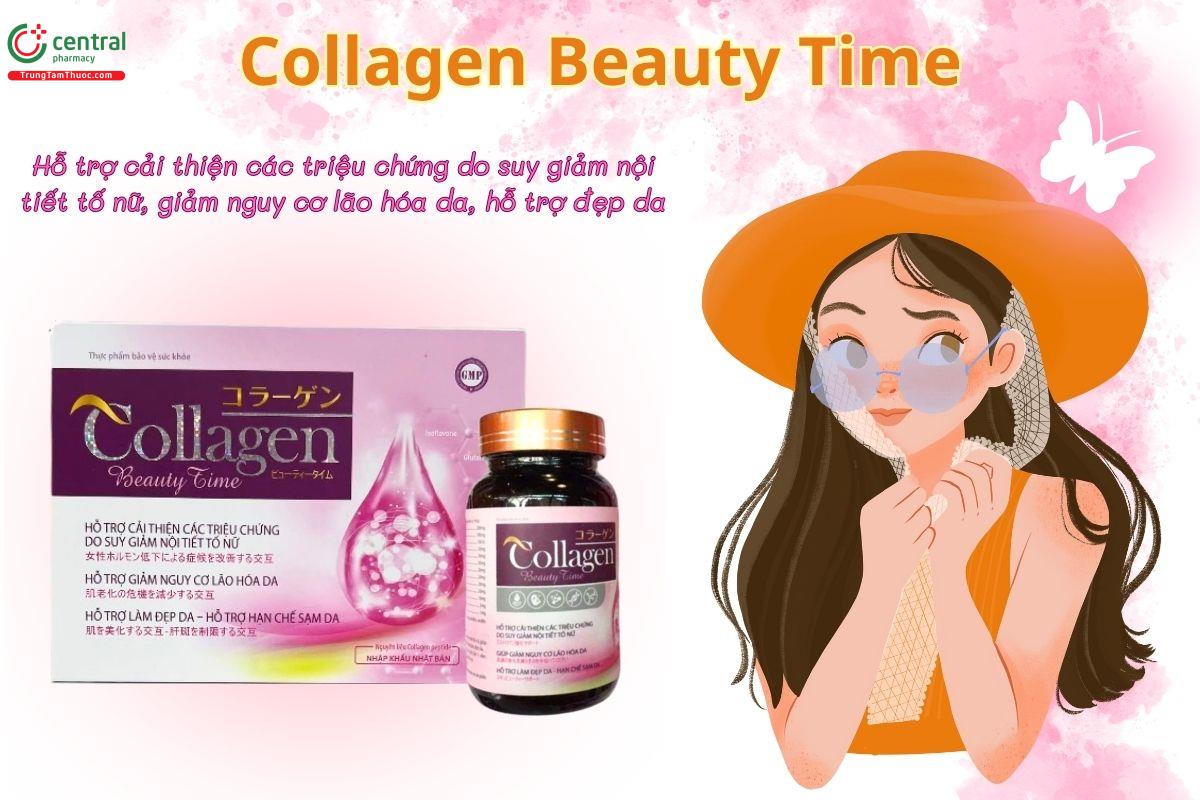 Viên uống Collagen Beauty Time giúp hỗ trợ cân bằng nội tiết tố nữ, từ đó cải thiện các triệu chứng do suy giảm nội tiết tố gây ra. Đồng thời, nó còn góp phần làm chậm quá trình lão hóa da, giúp làn da trở nên mịn màng, tươi sáng và giảm tình trạng sạm nám, khô da, nhăn da.