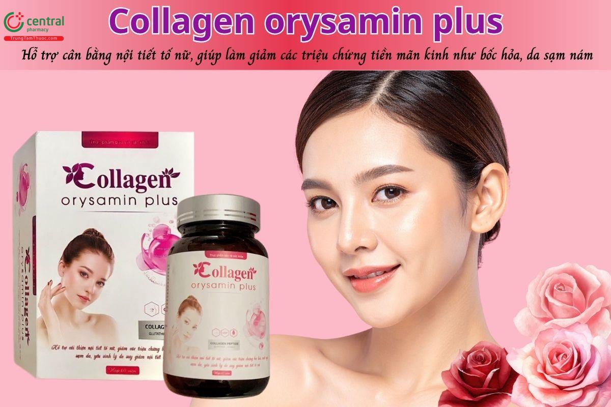 Collagen Orysamin Plus là thực phẩm bảo vệ sức khỏe có tác dụng hỗ trợ cân bằng nội tiết tố nữ, giúp làm giảm các triệu chứng tiền mãn kinh như bốc hỏa, khó ngủ, da sạm nám và suy giảm sinh lý do rối loạn hormone.