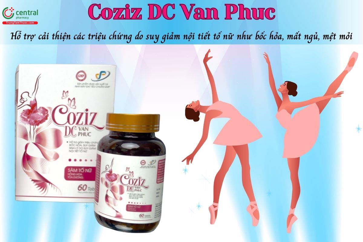 Viên uống Coziz DC Van Phuc giúp hỗ trợ cải thiện các triệu chứng thường gặp do suy giảm nội tiết tố nữ như bốc hỏa, mất ngủ, mệt mỏi hay giảm ham muốn. Bên cạnh đó, sản phẩm còn góp phần tăng cường sức khỏe sinh lý và cân bằng hormone tự nhiên cho phụ nữ.