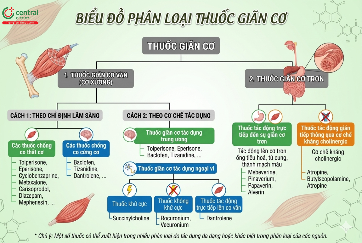 | Thuốc giãn cơ vân (cơ xương) | Theo chỉ định lâm sàng | Antispasmodics (chống co thắt cơ) | Tolperisone, Eperisone, Cyclobenzaprine, Methocarbamol, Carisoprodol, Diazepam, Mephenesin |