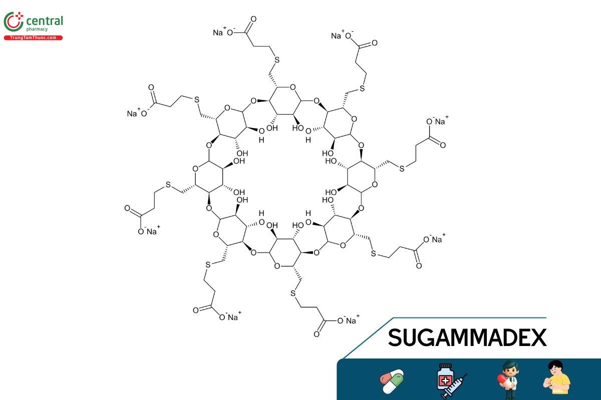 Sugammadex hoạt động bằng cách tạo phức theo tỷ lệ 1:1 với các thuốc giãn cơ steroid (ưu tiên rocuronium > vecuronium ≫ Pancuronium). Nó hình thành phức hợp “khách - chủ”, bao bọc hoàn toàn phân tử thuốc giãn cơ, từ đó nhanh chóng loại bỏ rocuronium tự do khỏi huyết tương. Phức hợp này được thải trừ qua thận dưới dạng không biến đổi.