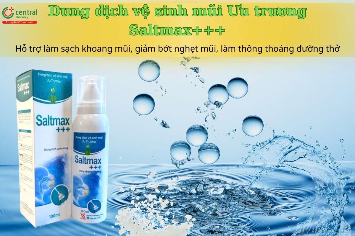 Dung dịch vệ sinh mũi Ưu trương Saltmax+++ giúp làm sạch khoang mũi, hỗ trợ loại bỏ gỉ mũi, dịch nhầy và bụi bẩn. Sản phẩm thường dùng khi cảm lạnh, viêm mũi, viêm xoang để giúp giảm nghẹt mũi, làm thông thoáng đường thở và hạn chế nguy cơ nhiễm khuẩn.