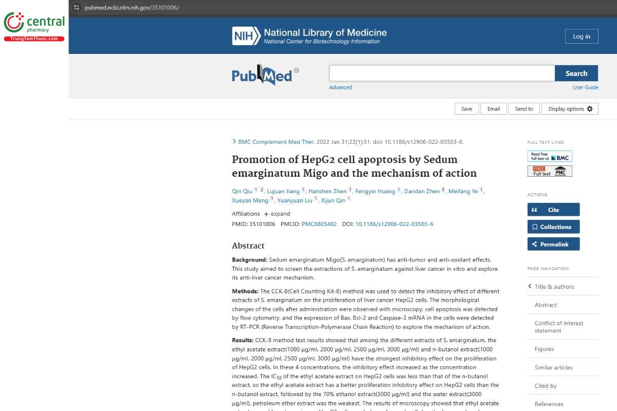 - Qiu Q, Jiang L et al (Đăng ngày 31 tháng 1 năm 2022), Promotion of HepG2 cell apoptosis by Sedum emarginatum Migo and the mechanism of action, Pubmed. Truy cập ngày 26 tháng 12 năm 2025.