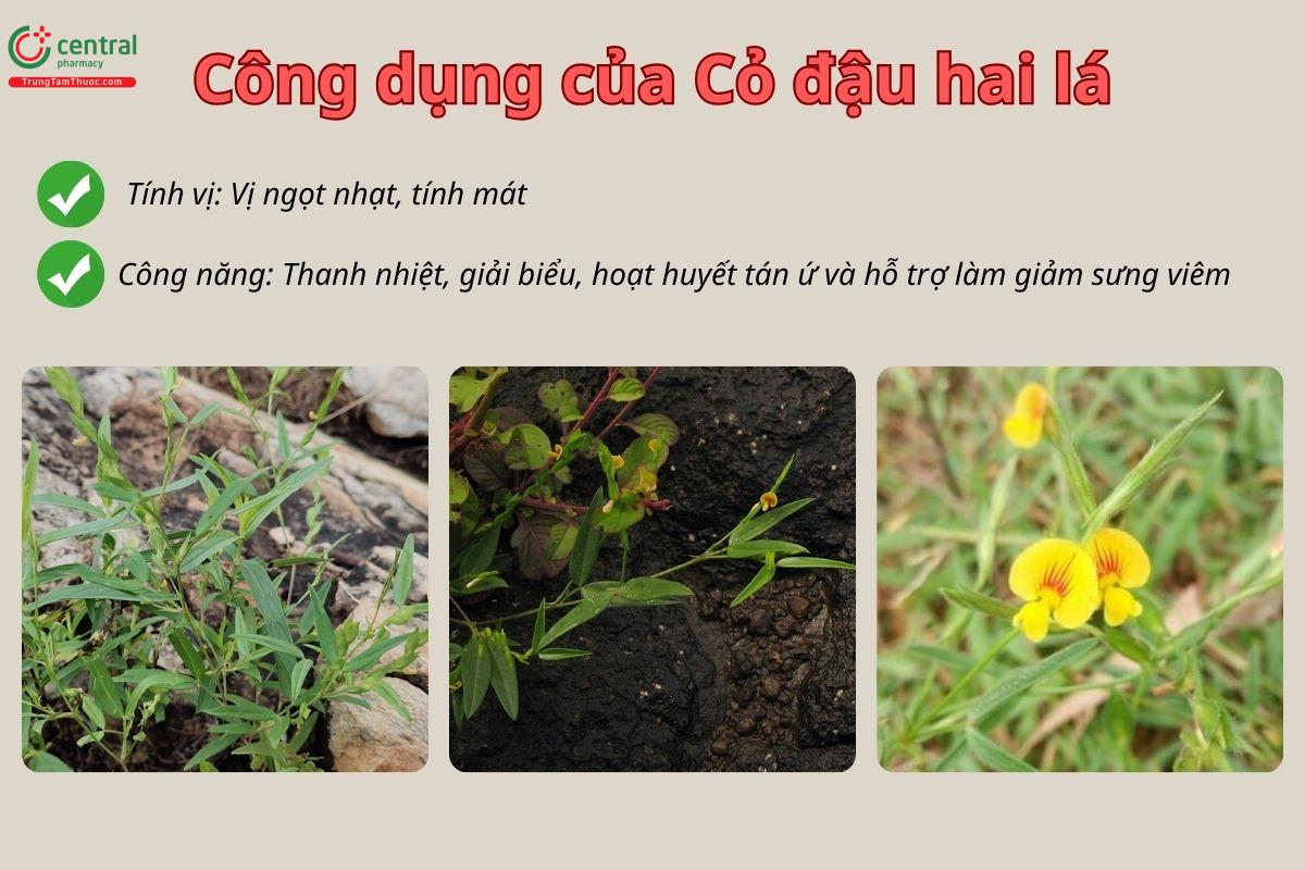 Theo y học cổ truyền, dược liệu Cỏ đậu hai lá có tác dụng thanh nhiệt, giải biểu, hoạt huyết tán ứ và hỗ trợ làm giảm sưng viêm như: