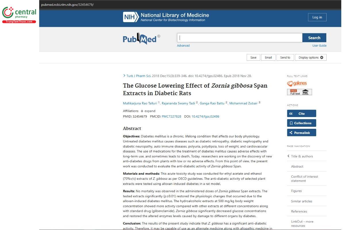 - Talluri MR, Tadi RS et al, (Đăng ngày: 20 tháng 11 năm 2018), The Glucose Lowering Effect of Zornia gibbosa Span Extracts in Diabetic Rats, Pubmed. Truy cập ngày 31 tháng 12 năm 2025.